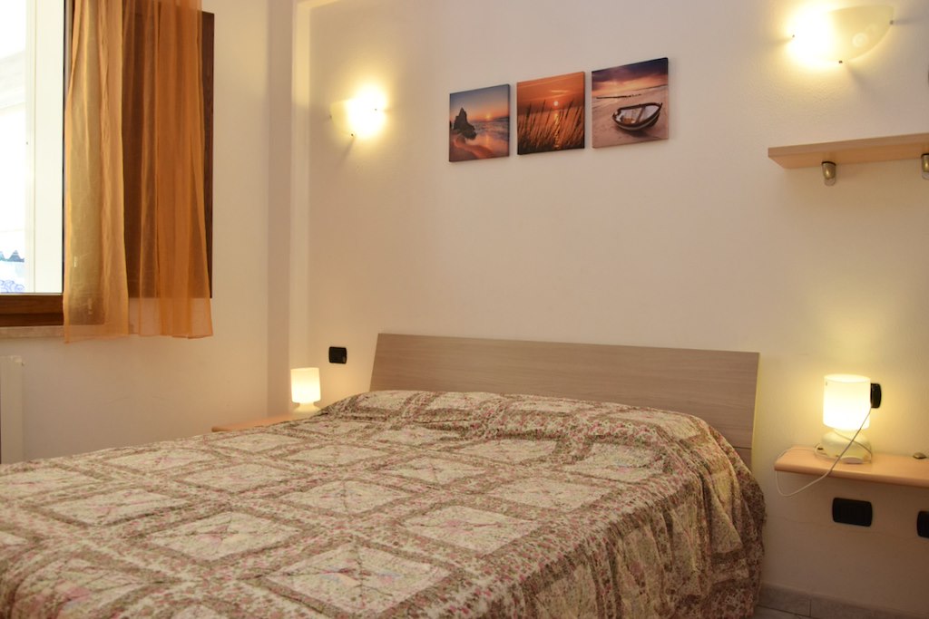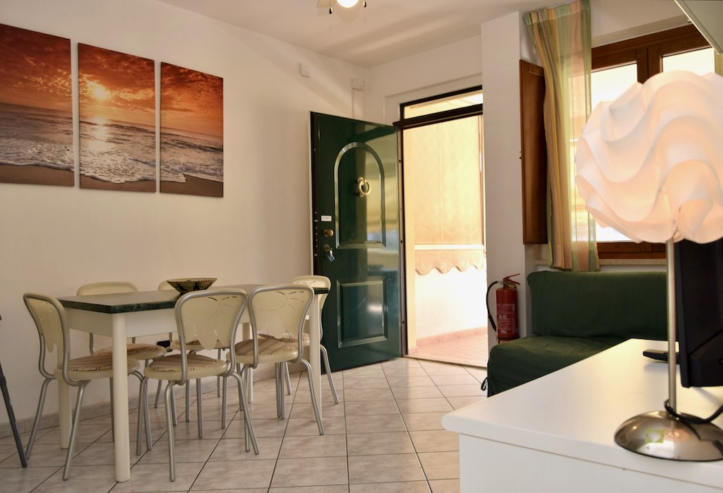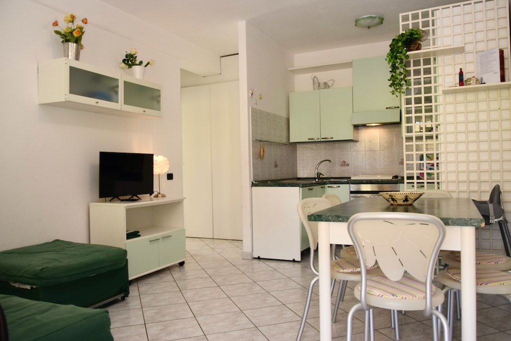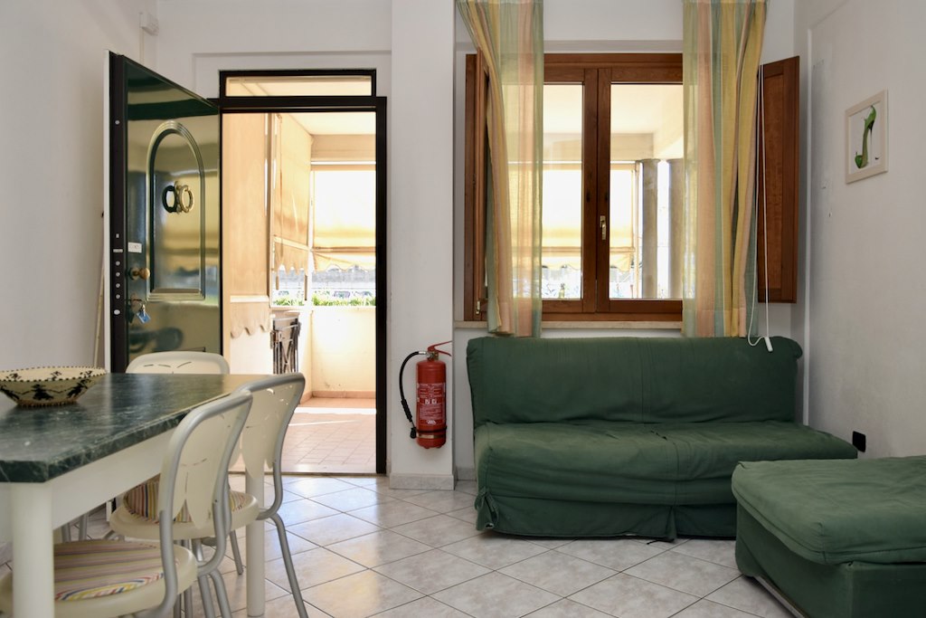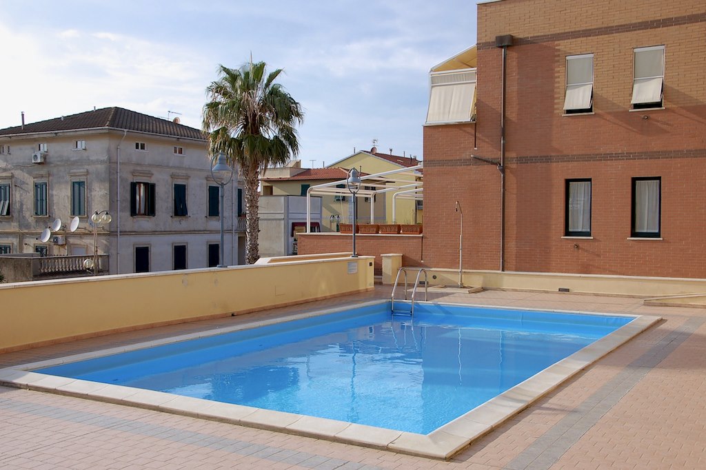 Appartartamento bilocale al piano primo con ascensore a pochi passi dal mare, centralissimo e con accesso diretto alla passeggiata. Offre zona giorno pranzabile con angolo cottura, terrazza coperta pranzabile di 20 mq, camera matrimoniale con letto a castello aggiunto, bagno con box doccia.Lavatrice, lavastoviglie, televisione, asse e ferro da stiro, ventilatore a soffitto in zona giorno, seggiolone per bambini. Piscina condominiale a disposizione allo stesso piano dell'appartamento da giugno a metà settembre. Posto auto privato e coperto.L'appartamento si trova direttamente sulla passeggiata e in prossimità della spiaggia libera e attrezzata: lo stabilimento balneare più comodo per la sistemazione é il Bagno Nettuno, a seguire Bagno Mediterraneo.