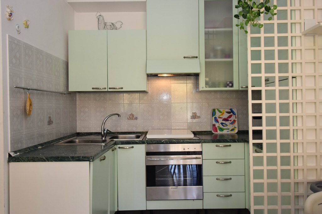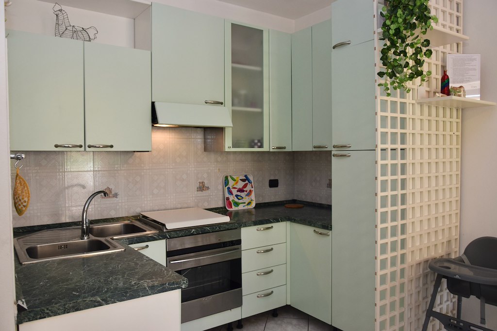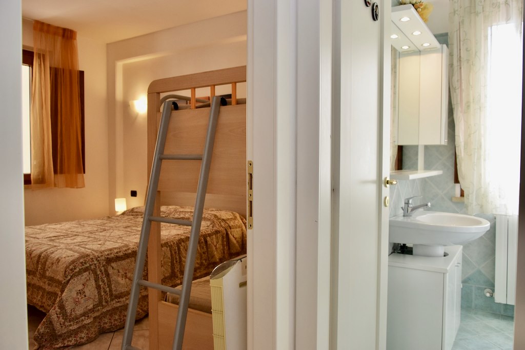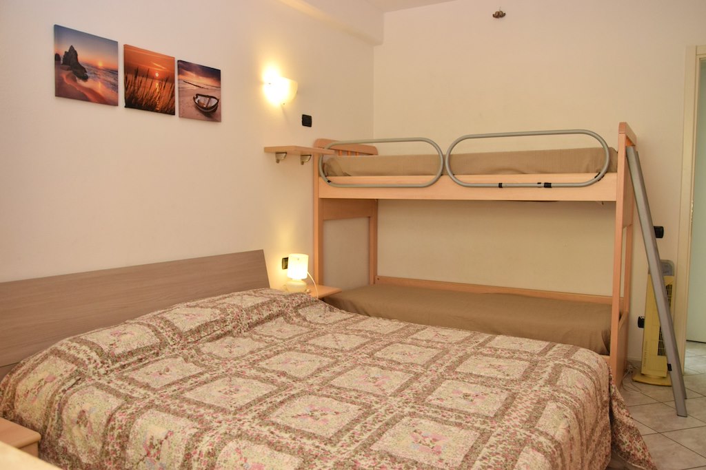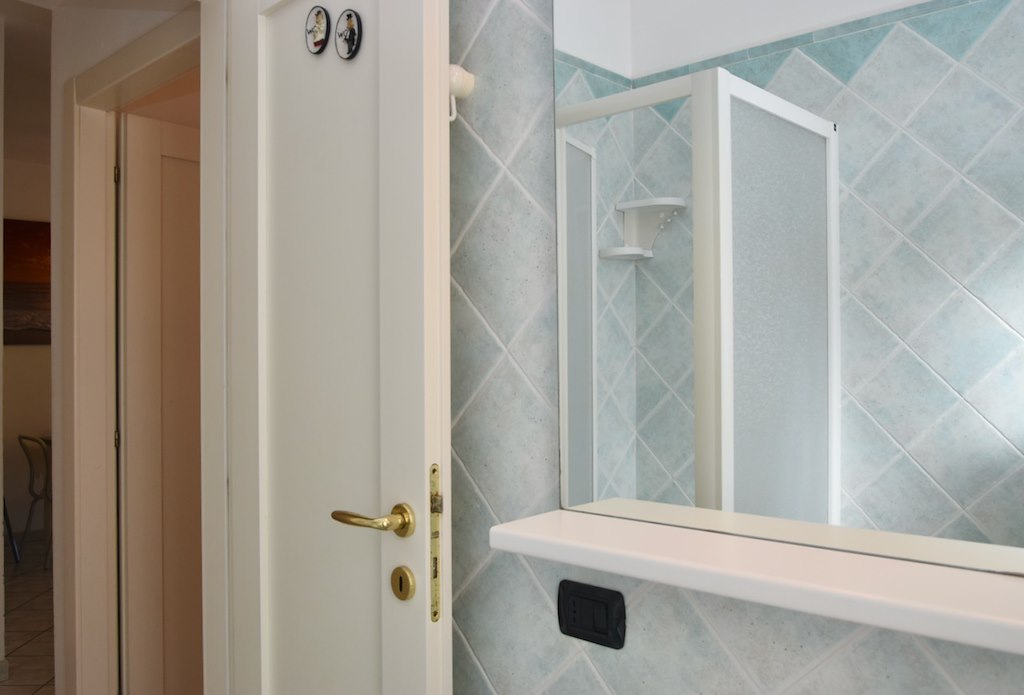 Appartartamento bilocale al piano primo con ascensore a pochi passi dal mare, centralissimo e con accesso diretto alla passeggiata. Offre zona giorno pranzabile con angolo cottura, terrazza coperta pranzabile di 20 mq, camera matrimoniale con letto a castello aggiunto, bagno con box doccia.Lavatrice, lavastoviglie, televisione, asse e ferro da stiro, ventilatore a soffitto in zona giorno, seggiolone per bambini. Piscina condominiale a disposizione allo stesso piano dell'appartamento da giugno a metà settembre. Posto auto privato e coperto.L'appartamento si trova direttamente sulla passeggiata e in prossimità della spiaggia libera e attrezzata: lo stabilimento balneare più comodo per la sistemazione é il Bagno Nettuno, a seguire Bagno Mediterraneo.